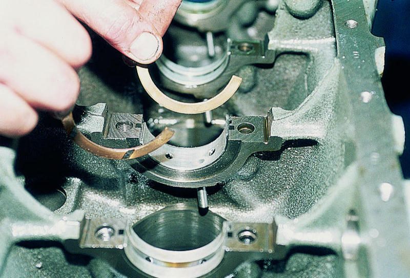 24. Выньте из опор блока цилиндров верхние вкладыши коренных подшипников коленчатого вала.