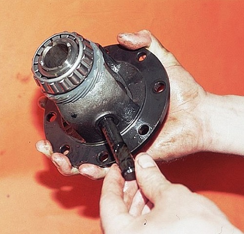 6. Выдавите пальцами ось саттелитов из корпуса дифференциала.
