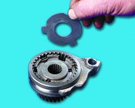 12. Сверху в синхронизаторе снимите упорную пластину, и потом в самом синхронизаторе в пазе муфты достаньте вилку.