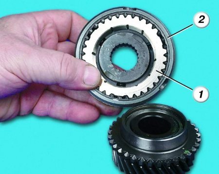 13. С синхронизатора также снимите шестерню пятой передачи и блокирующее кольцо 1. Нужно пронумеровать блокирующее кольцо 1 и муфту 2, а затем снять кольцо.