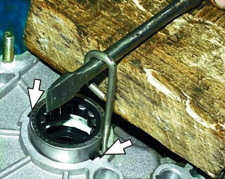 38. Выпрессуйте подшипник первичного вала специальным съёмником. Если такого не имеется, тогда необходимо согнуть проволоку в форме крючка, вставить её в паз картера и крючок поместить под подшипник. Отвёрткой выпрессуйте подшипник из картера, подложив под отвёртку деревянный брус и стучите по отвёртке молотком, переставляя крючок в пазах.