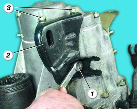 4. Коробку передач поставьте в вертикальное положение на картер сцепления на верстат и открутите болт 1 с плоской шайбой, а также две гайки 3 с пружинной шайбой, которые крепят кронштейн троса сцепления. Этот кронштейн, открутив все болты, снимите с коробки передач.