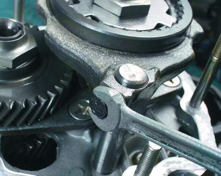 7. Болт с пружинной шайбой, который держит вилку для пятой передачи, следует открутить ключом на 10 мм.