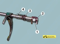 21. Если необходимо разобрать шток включения 5-й передачи и заднего хода, то сначала выверните стопорный болт 1, а затем снимите со штока головку 2, блокировочную втулку 3 и пружину 4.