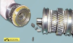 26. Аккуратно разъедините первичный и вторичный валы, не забывая о том, что насыпные ролики (14 шт.) переднего подшипника вторичного вала могут выпасть из гнезда первичного вала.