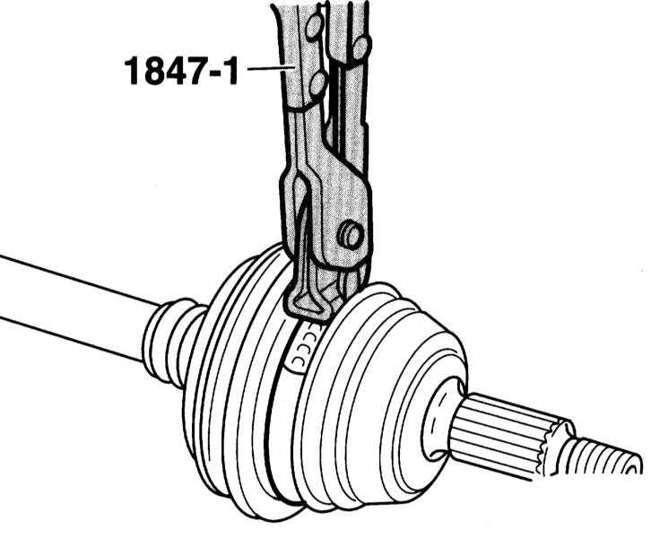 Наружный шарнир: для зажима хомутов (легированная сталь) необходимо применять показанные на иллюстрации специальные клещи HAZET 1847, в противном случае необходимая сила сжатия не достигается. Клещи необходимо установить, как показано на иллюстрации. Рабочие кромки клещей должны быть в уголках (В). В этом положении винт (А) затягивается моментом 20Нм. Зажим хомута на малом диаметре выполняется аналогичным образом.