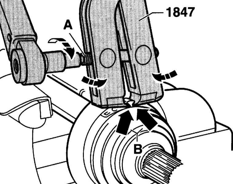 Для зажима хомутов (легированная сталь) необходимо применять показанные на иллюстрации специальные клещи HAZET 1847, в противном случае необходимая сила сжатия не достигается. Клещи необходимо установить, как показано на иллюстрации. Рабочие кромки клещей должны быть в уголках (В). В этом положении винт (А) затягивается моментом 20Нм. Зажим хомута на малом диаметре выполняется аналогичным образом.