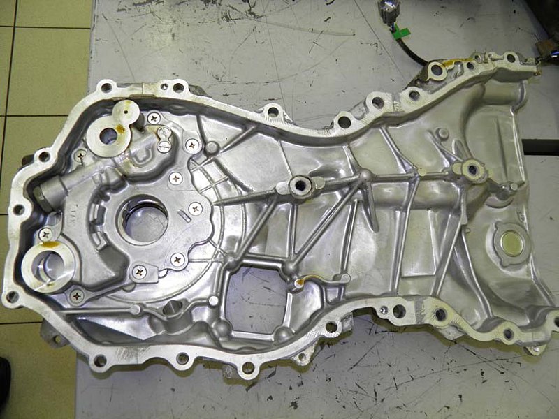 1. Отверните четырнадцать болтов и две гайки крепления крышки цепи привода механизма газораспределения.