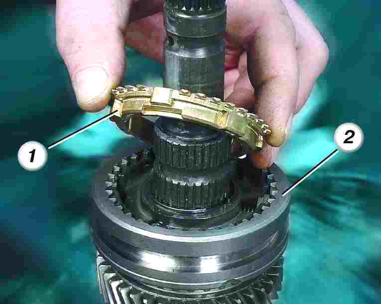 10. Снимите синхронизатор с блокирующим кольцом 1-2-й передачи и промаркируйте кольцо 1 относительно муфты 2 синхронизатора.
