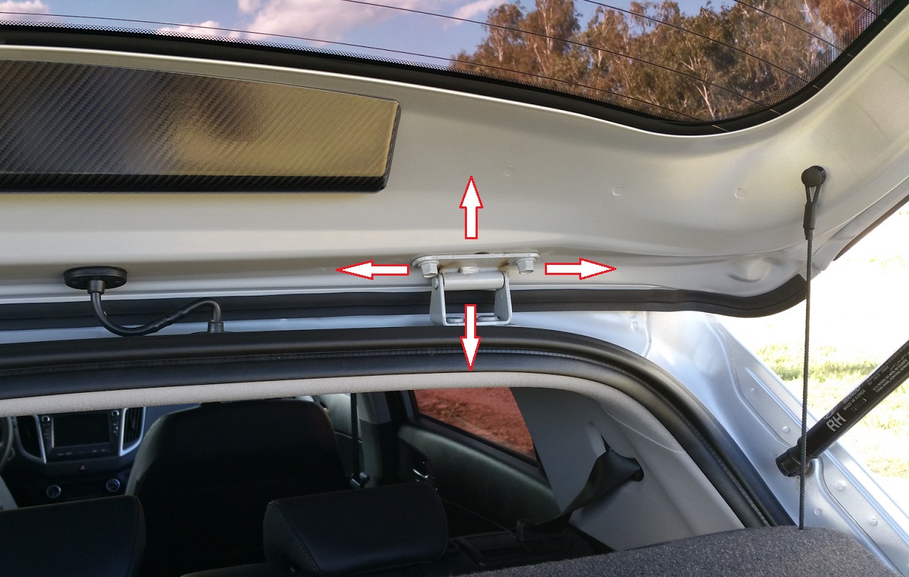 7. Перемещая фиксатор вверх или низ, влево или вправо, добейтесь легкого и плавного закрывания двери. Замок должен надежно удерживать дверь багажника Креты закрытой.