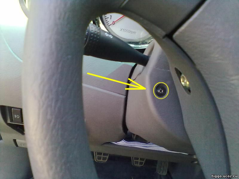 Вначале снимаем черную окантовочную рамку с панели приборов (она на защелках - просто вытаскивается на себя). Далее отворачиваем два самореза под рулевым колесом и один снизу по центру кожуха.