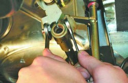 Ослабьте затяжку гайки стяжного болта хомута крепления рычага выбора передач привода к тяге кулисы рычага управления коробкой передач и небольшими перемещениями ступицы рычага по тяге добейтесь четкого включения передач. Если нечетко выбираются I и II передачи, немного поверните рычаг относительно тяги по часовой стрелке (если смотреть на привод со стороны двигателя). При нечетком выборе V передачи и передачи заднего хода поворачивайте рычаг против часовой стрелки. Если четко выбираются, но плохо включаются (или совсем не включаются) I, III, V передачи и передача заднего хода, переместите рычаг по тяге назад по направлению движения автомобиля, не проворачивая его относительно тяги. При нечетком включении II и IV передач рычаг перемещайте вперед по тяге. После каждого перемещения рычага по тяге затягивайте гайку стяжного болта хомута и проверяйте результат регулировки. При необходимости повторяйте регулировку до получения требуемого результата.