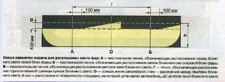 Установите автомобиль напротив ровной вертикальной стены на расстоянии 2-3 м и включите ближний свет. Верхние границы световых лучей должны находиться на одном уровне и быть четкими.