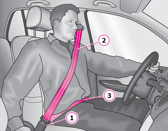 1. Чтобы пристегнуть ремень, плавно вытяните его и вставьте язычок в замок 1 до щелчка. При этом следите, чтобы ремень не перекручивался. Верхняя ветвь 2 ремня должна проходить примерно через середину плеча (ни в коем случае не через шею), а нижняя 3 – плотно облегать тазобедренную часть тела.