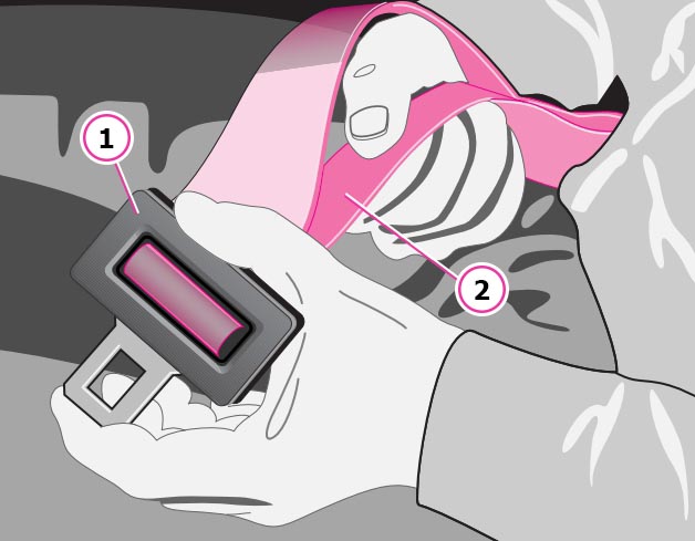 4. Поскольку ремень заднего среднего пассажира не инерционный, его необходимо отрегулировать. Правильно отрегулированный ремень должен плотно прилегать к пассажиру. Чтобы удлинить ремень, поверните его пряжку 1 перпендикулярно ремню и потяните за длинный конец 2.