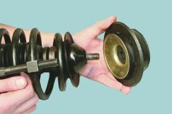 Примечание: Верхняя опора стойки и упорный подшипник представляют собой неразборный узел, поэтому в случае неисправности или повреждения одного из двух элементов необходимо заменить узел в сборе. 5. Снимите верхнюю тарелку пружины.