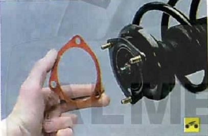 ...совпала с меткой на верхней тарелке пружины, причем обе метки при установке стойки на автомобиль должны быть направлены в сторону наружной части автомобиля.