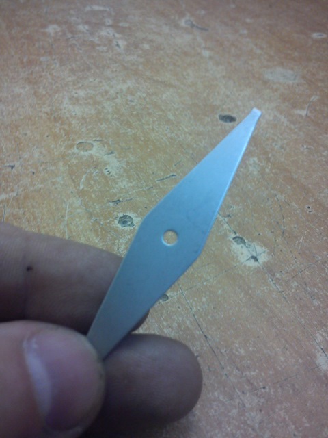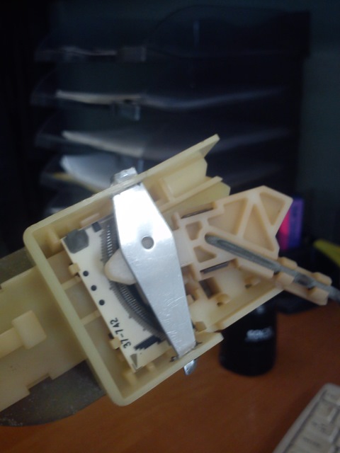 Но решил использовать все же так называемую "стрелку-отвертку". Канцелярским ножом была сделана прорезь в корпусе с двух сторон и вставлена эта стрелка отвертка. Вот как получилось: