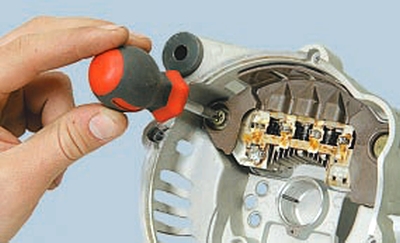 19. Изнутри крышки со стороны контактных колец выверните винт крепления и снимите выпрямительный блок.