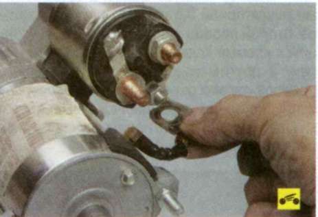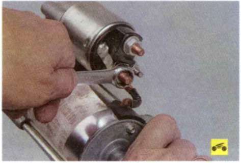 4. Отсоедините провод от управляющего вывода тягового реле и подсоедините к нижнему контактному болту тягового реле. Якорь стартера должен начать вращаться с частотой более 6000 мин"'. В противном случае отремонтируйте стартер.