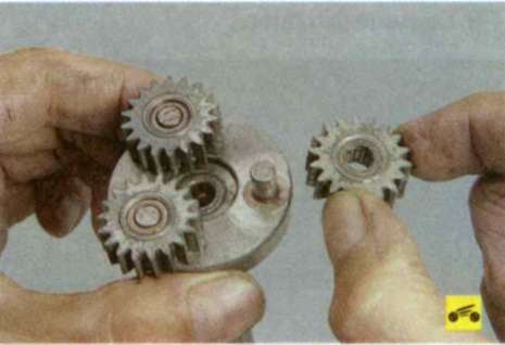 27. Проверьте привод. Зубья шестерни привода не должны иметь значительного износа. Шестерня должна легко проворачиваться относительно ступицы муфты в направлении вращения якоря и не должна проворачиваться в противоположном направлении. Если зубья шестерни изношены или повреждены либо шестерня проворачивается в обоих направлениях, замените привод.