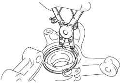 Используя приспособление для установки стопорных колец, установите новое стопорное кольцо отверстия ступицы переднего колеса.