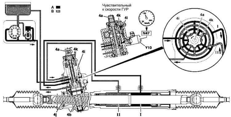 Гидравлический контур и элементы чувствительного к скорости автомобиля рулевого управления: