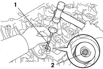 4. Деревянной киянкой или молотком с пластиковым бойком и стержнем неиспользуемого клапана, обернутым изоляционной лентой, ударьте по торцу стержня клапана, чтобы обеспечить надежную фиксацию клапана сухарями.