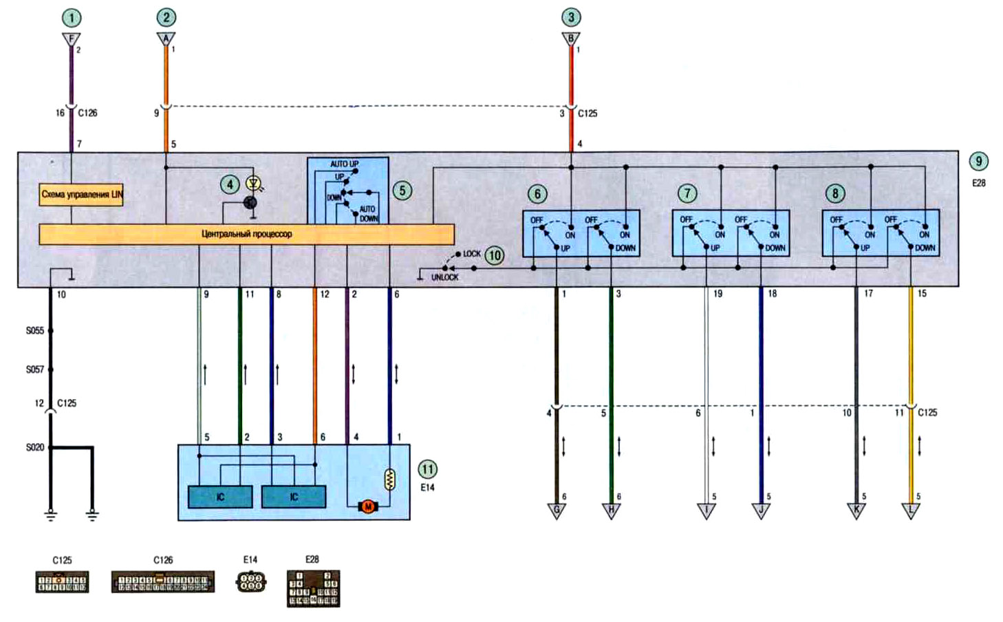 Продолжение схемы электростеклоподъемников для автомобилей с системой центральной блокировки замков дверей: