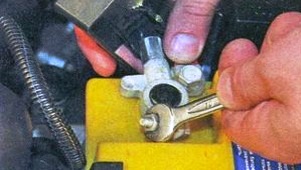 1. Ключом на 10 мм ослабьте затяжку гайки «минусового» вывода батареи.