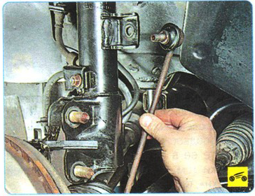 9. Удерживая от проворачивания головку верхнего стяжного болта, отверните гайку крепления поворотного кулака к амортизаторной стойке...