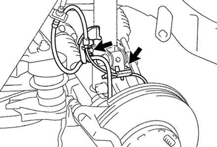 Рис. 4.24. Отсоединение тормозного шланга и жгута проводов датчика частоты вращения (ABS)