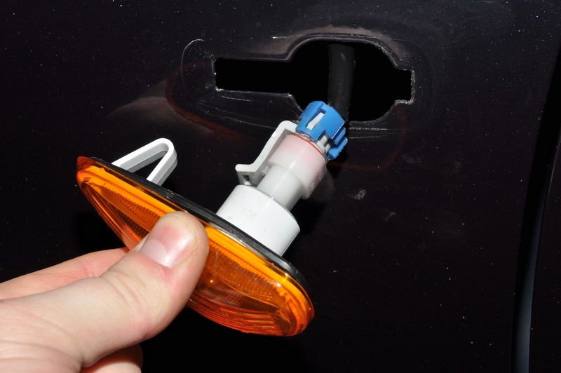 1. Сдвинув в сторону передней части автомобиля боковой указатель поворота, достаньте указатель из отверстия в переднем крыле.