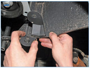 Отогнув край грязезащитного щитка моторного отсека, выводим из-под него подкрылок.