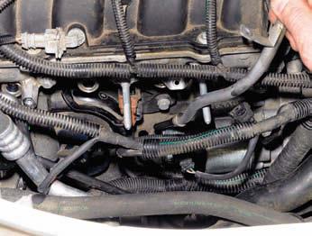 Нажав на проволочный фиксатор колодки жгута проводов системы управления двигателем, отсоединяем колодку от разъема датчика.