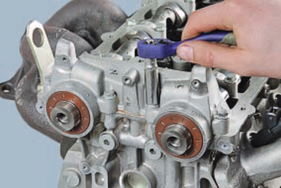 15. Установите крышки подшипников распределительных валов и равномерно затяните болты их крепления моментом 14–15 Н·м, переходя от болта к болту через оборот.