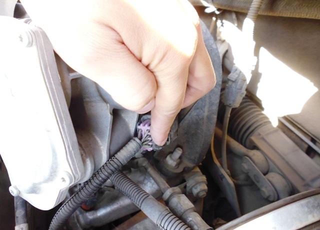 3. Нажав на фиксатор колодки жгута проводов системы управления двигателем, отсоедините колодку от разъема блока управления узла.