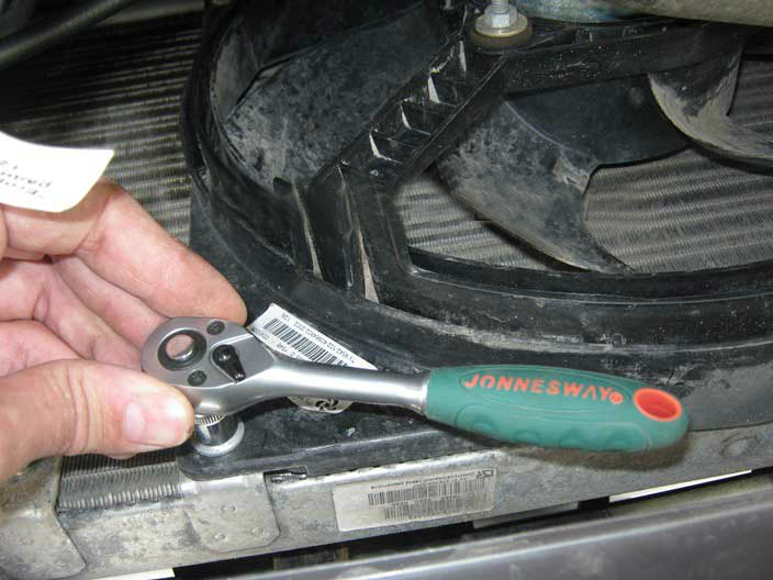 4. Головкой на 10 мм отверните два болта верхнего и один болт нижнего крепления кожуха вентилятора.