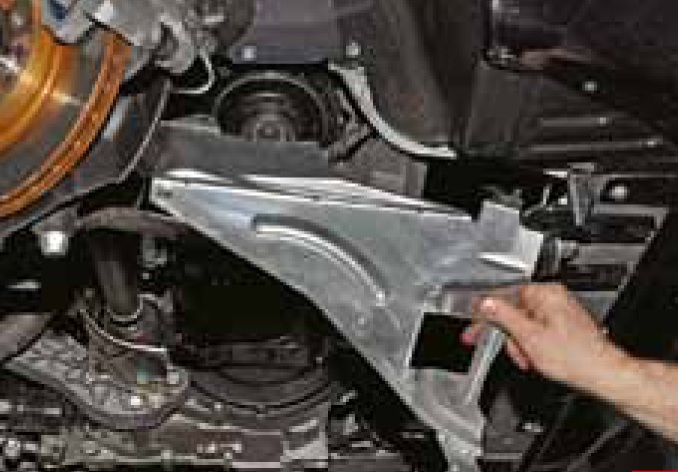 Правый грязезащитный щиток снимите при снятии правой опоры силового агрегата и для получения доступа к агрегатам автомобиля с правой стороны.