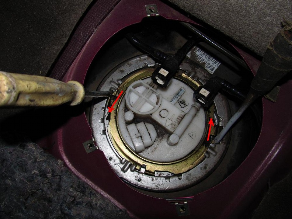 7. Снимите топливные шланги с крышки бензонасоса, которые крепятся фиксаторами (см. первое фото). Надавите одной отверткой на фиксатор с одной стороны. Другой отверткой подденьте топливный шланг по направлению стрелки и снимите его.