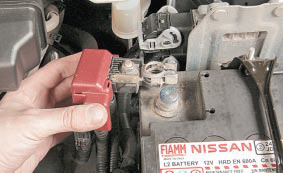 5. Отсоедините провод от клеммы «плюс» аккумуляторной батареи Ниссан Кашкай.