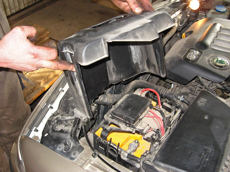 13. Снимите чехол с АКБ Шкода Октавиа Тур.