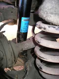 6. Вынимаем второй домкрат. Выкручиваем верхние болты, и сжав амортизатор, вынимаем его наружу. С помощью нашего "приспособления" (в виде головы на 17 с большим внутр отверстием, куда вставляется цилиндр (с одной стороны овал под шток амортизатора, с другой под ключ на 13) снимаем верхнюю опору.
