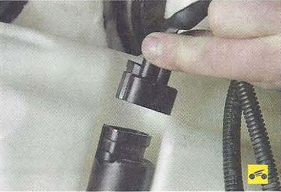7. Нажмите на фиксатор колодки жгута проводов и отсоедините колодку от разъема датчика уровня жидкости в бачке омывателя.