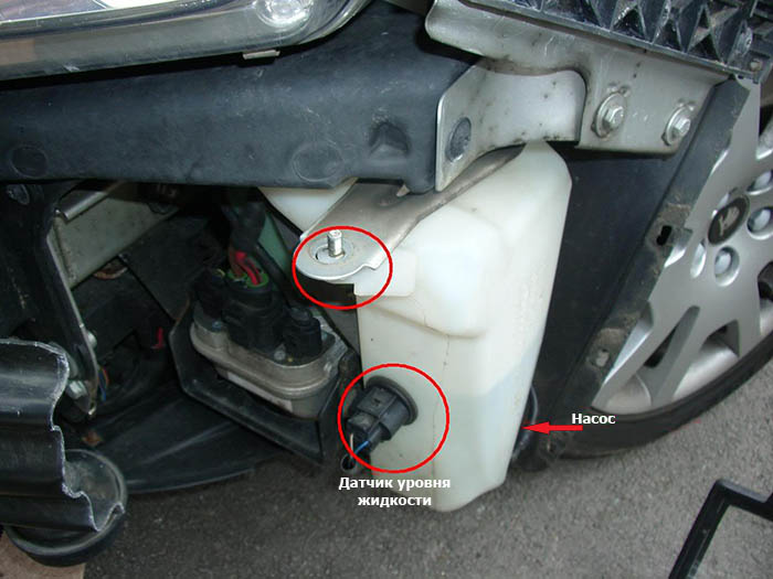 9. Установите бачок омывателя с насосом в обратном порядке и залейте в него жидкость.