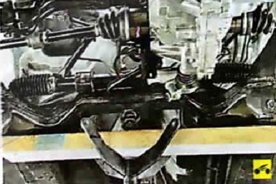 19. Опустите гидравлическую стойку (или домкрат) под балкой и снимите поперечину в сборе с рулевым механизмом и рычагами передней подвески.
