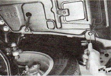 9. Для снятия боковых брызговиков двигателя снимите передние колеса с помощью домкрата и балонного ключа, извлеките по два фиксатора крепления левого и правого брызговиков, после чего снимите брызговики.