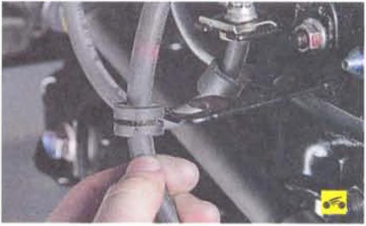 8. Подденьте отверткой пластмассовый держатель жгута проводов и извлеките его из отверстия брызговика двигателя.