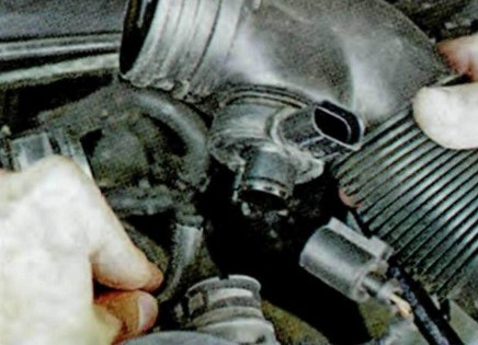 8. Отсоедините от воздуховода шланг системы рециркуляции отработавших газов и находящийся под ним вакуумный шланг от впускного коллектора.