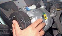 13. Отворачиваем болты крепления компрессора кондиционера к кронштейну и, не разъединяя трубок системы кондиционирования, отводим компрессор в сторону и подвязываем, чтобы он не мешал снятию двигателя.